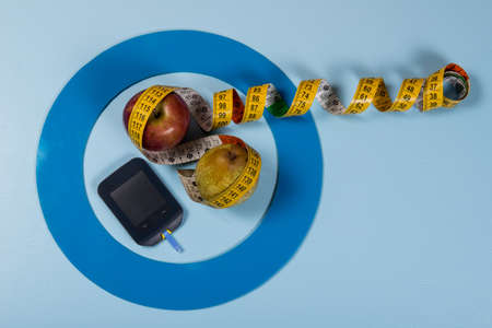 An Apple with a measuring tape around it with a scale on a blue background. The concept of a self-isolation diet. weight loss at home. Apples and floor scales.