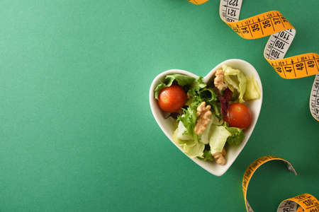 Concept of diet and health with heart-shaped bowl with salad with nuts and metric tape on a green background. Top view. Landscape composition.