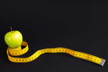 Green apple and measuring tape with centimeters and inches isolated on black background.