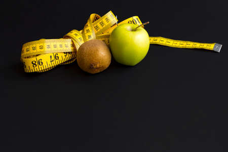 Green apple, kiwi and measuring tape with centimeters and inches isolated on black background.