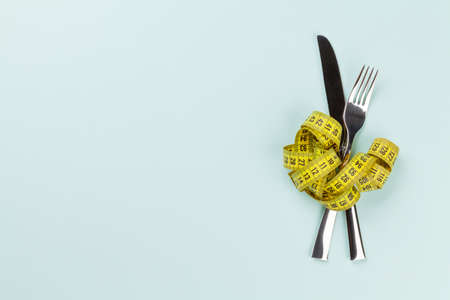 Fork and Measuring Tape on blue background, copy space. Diet, healthy lifestyle, weight loss concept with white fork and measuring tape.