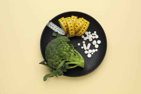 Plate with weight loss pills, measuring tape and broccoli on beige background, top view
