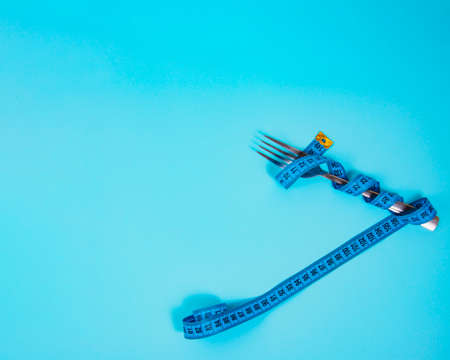 Centimeter and fork on blue background. The concept of diet healthy eating and weight loss.