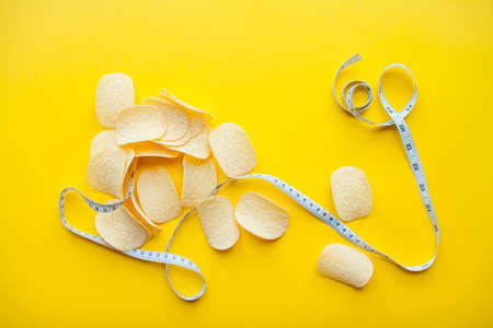 Chips and measuring tape on a bright yellow background. Weight loss and dieting concept. High quality photo