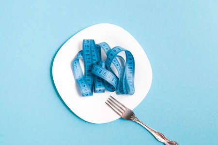 blue measuring tape on a white plate and fork, blue background, opium seats, top view, diet concept, weight loss and fasting