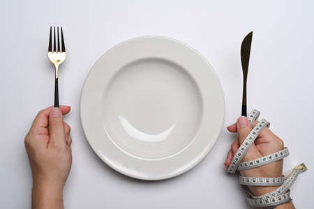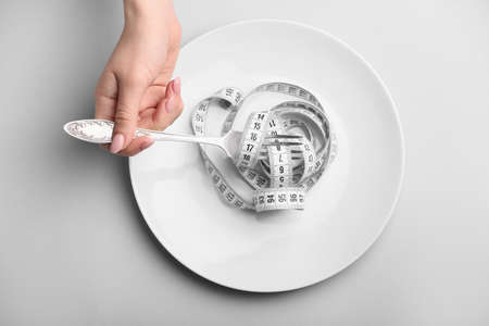 Female hand with plate, fork and measuring tape on gray background. Concept of anorexia