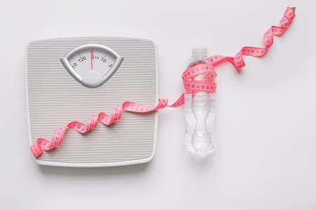 Scales and measuring tape with bottle of water on white background. Weight loss concept