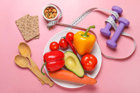 Different healthy food with measuring tape and dumbbells on color background. Diet concept
