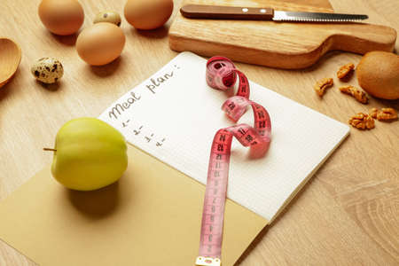 Meal plan with measuring tape and healthy products on table