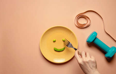 Diet and Health Care Concept. Young Woman Using Fork to Eating Green Soy Bean on Plate. Surrounded by Dumbbell and Soft Tape Measure. Top View