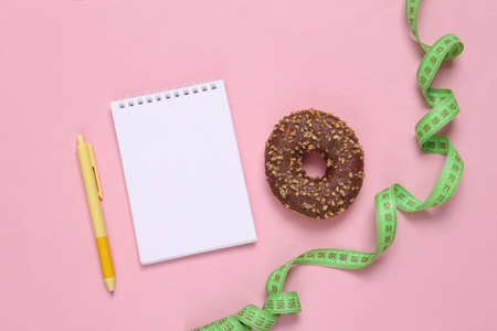weight loss plan. Notepad with skipping rope and high-calorie donut on a pink background.