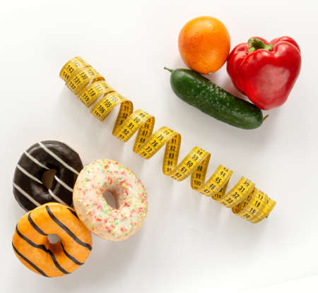 A collage of unhealthy and healthy food located on a white background. Food is divided by a measuring tape. Junk food leads to overweight. Vegetables and fruits are good for health and keep a slim figure.