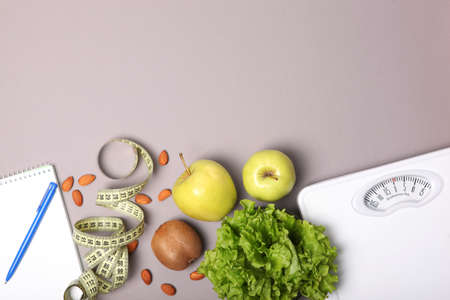floor scales, tape measure and healthy products on a colored background top view