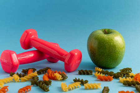 A shot of apple, dumbbells, and colorful pasta scattered on the blue surface - the concept of a sport and healthy nutrition