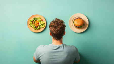 A young man sits at a table facing two plates, one with a vibrant salad and the other with a delicious burger, depicting a struggle between health and indulgence.