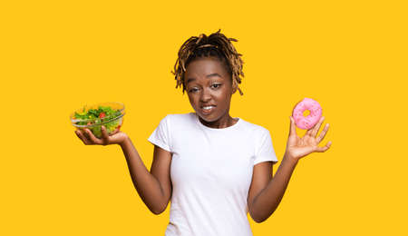 Confused black girl holding bowl with fresh salad and donut, choosing snack, yellow studio background