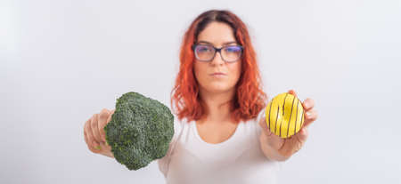 Caucasian woman chooses between vegetables and fast food. Redhead girl holding broccoli and donut on a white background.