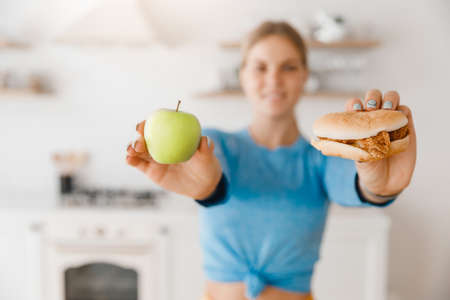 Beautiful young woman decides eating hamburger or fresh salad in kitchen.