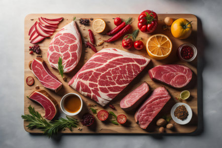 artistic arrangement of cuts of meat and garnish, created with generative ai