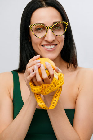 Cellulite is consequence of poor nutrition. Nutritionist holding measuring tape with orange fruit, panorama