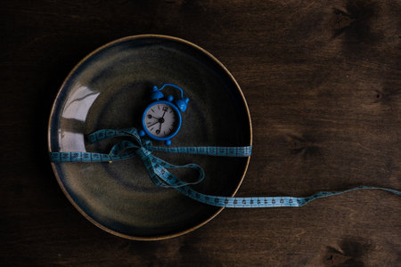 Lose weight concept of table setting with vintage clock and measure tape on wooden table with copy space