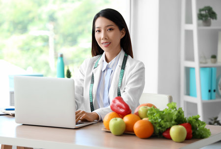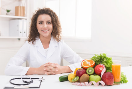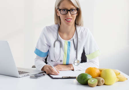 Portrait beautiful smart nutritionist woman in the nutritionist consultation.