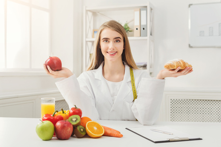 Dietitian with bun and fresh apple. Woman nutritionist holding fruit and croissant comparing junk and healthy food. Right eating nutrition concept.