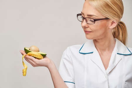 nutritionist doctor healthy lifestyle concept - holding organic avocado fruit and measure tape