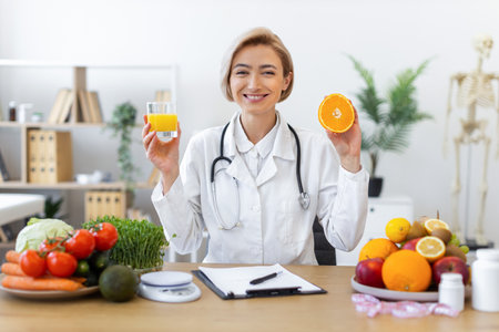 A nutritionist holds up a glass of juice and a sliced orange, promoting healthy eating and nutrition.