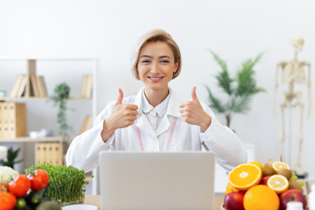 A smiling dietitian gives a thumbs up while working on her laptop, surrounded by healthy food.