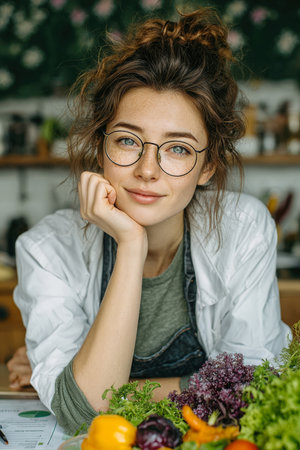 Confident, approachable young woman with glasses smiles warmly, leaning on table laden with fresh, colorful vegetables. Concept of health, wellness, nutrition, passion for healthy living, ideal for lifestyle, food-related content