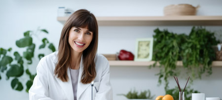 Female dietitian holding a clipboard with a food chart in a brightly lit kitchen with fruits and vegetables. Promoting healthy lifestyle and nutrition education.