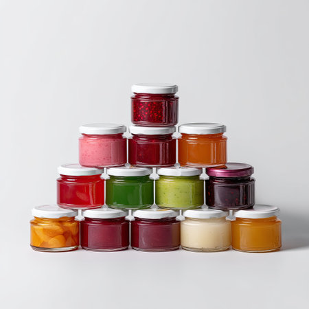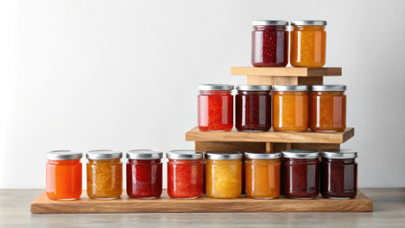 A visually appealing assortment of jars filled with various preserves and sauces, arranged in a creative pyramid structure against a neutral backdrop, perfect for culinary inspiration.