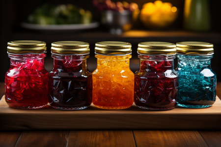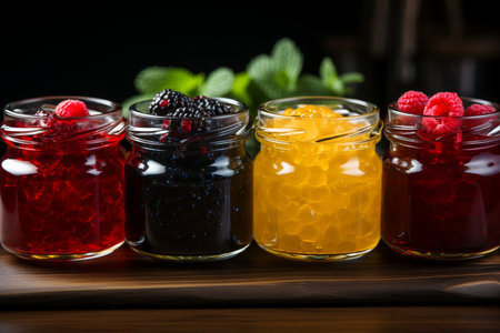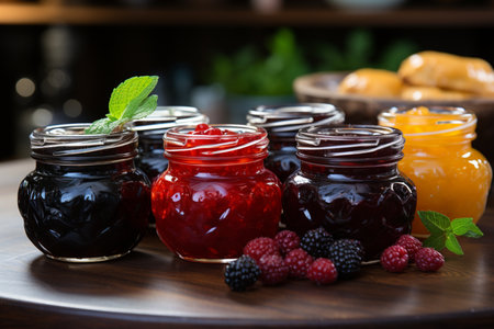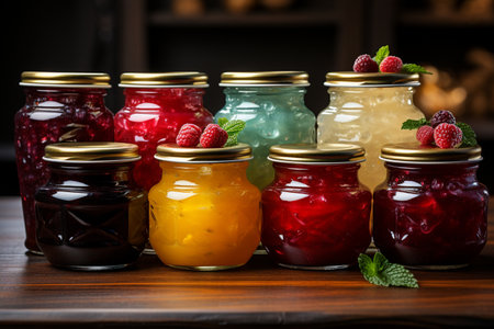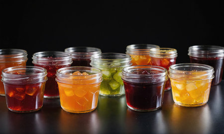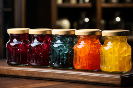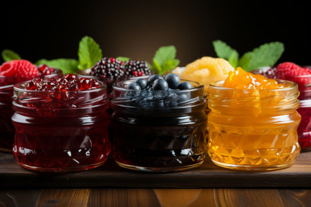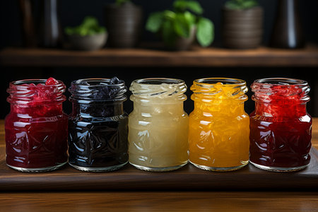 close-up of colorful fruit preserves in glass jars, created with generative ai