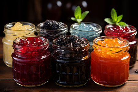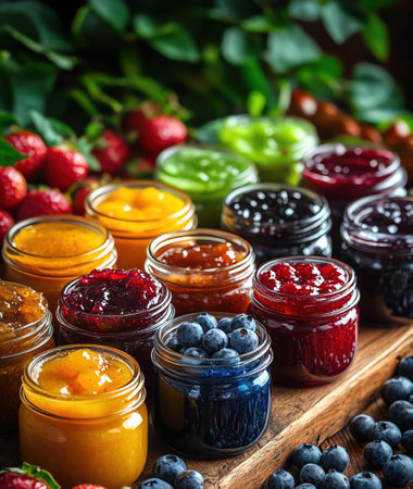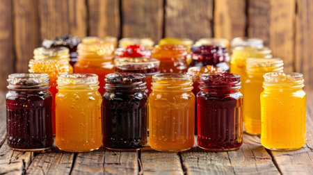 a variety of glass jars filled with colorful jams and jellies, created with generative ai