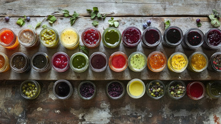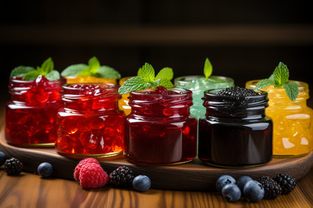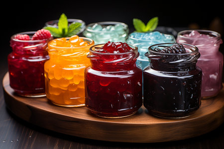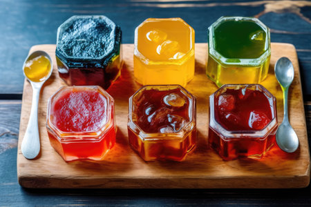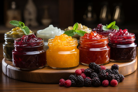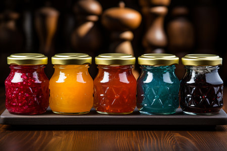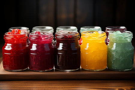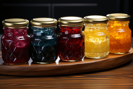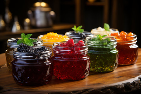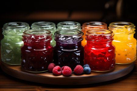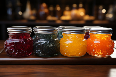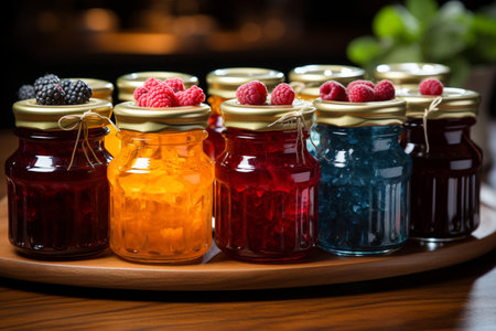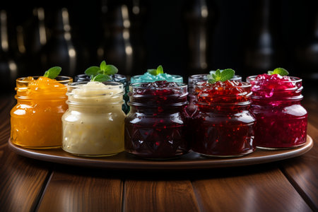 tray of homemade preserves, with variety of flavors and colors, created with generative ai