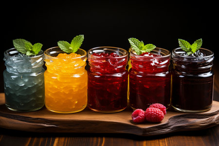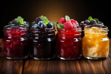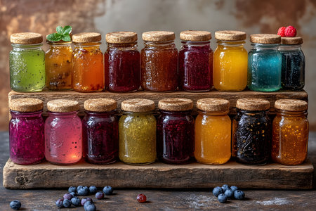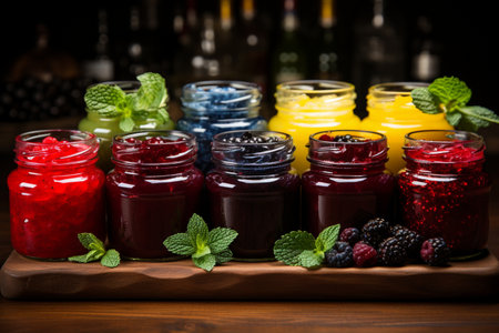 Vibrant selection of fruit jams in glass jars with cork lids, artfully arranged on a rustic wooden shelf. various flavors and colors are showcased, with fresh berries and mint leaves enhancing the visual appeal. Generative AI