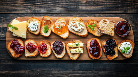 An image of a variety of toasted bread slices with different toppings, including jam, honey, and cheese, arranged on a rustic wooden board.