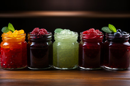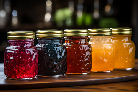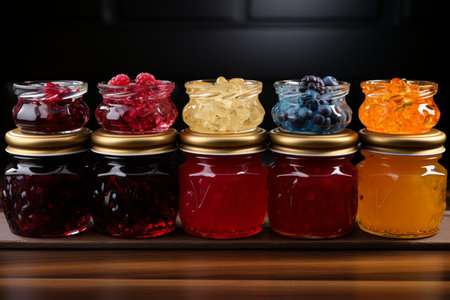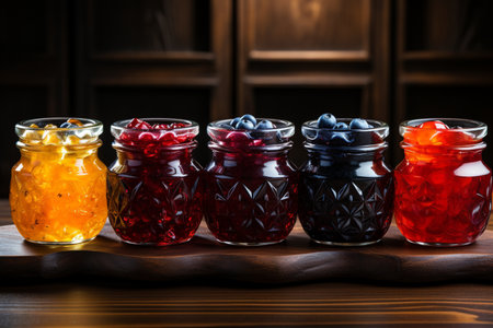 Variety of fruit jams lined up next to each other. AI-generated.