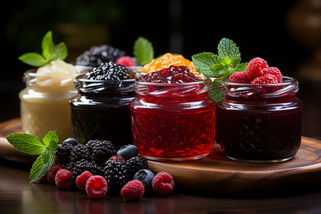 assortment of jams, seasonal berries, apricot, mint and fruits. marmalade or confiture