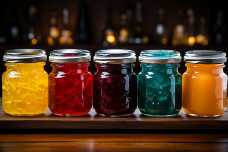 Variety of colorful fruit jelly in glass bottles on wooden background.