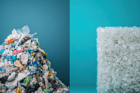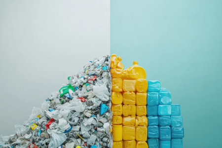 A pile of mixed plastic waste contrasts with orderly recycled products, highlighting the promise of a cleaner future.