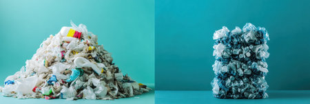 A chaotic pile of plastic waste vs. neatly arranged recycled plastic highlights the critical importance of recycling.