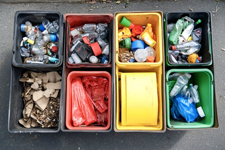 Overflowing colorful recycling bins stand on asphalt, filled with various discarded materials, highlighting the importance of waste separation and responsible environmental practices