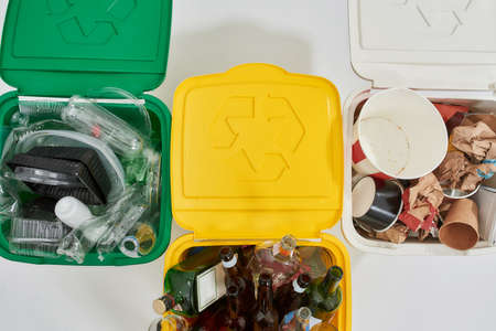 Cropped shot of three colorful green, yellow and white recycle garbage bins full of rubbish isolated on white background. Waste separation concept. Horizontal shot. Top view