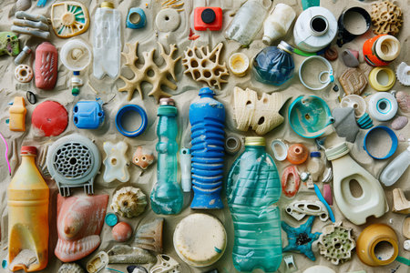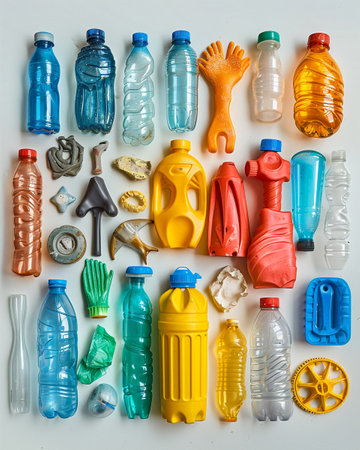 An overhead view displays various plastic containers and bottles arranged on a neutral surface. The composition features a range of colors and shapes, showcasing the diversity of the materials. The studio lighting enhances the clean lines, suggesting potential use in environmental or commercial projects.