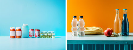 Assorted consumer products against minimalist blue and orange backgrounds, emphasizing clean design and contrasting color schemes in product packaging.