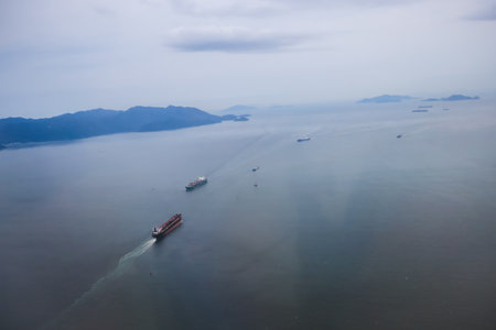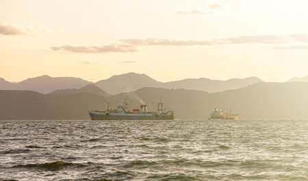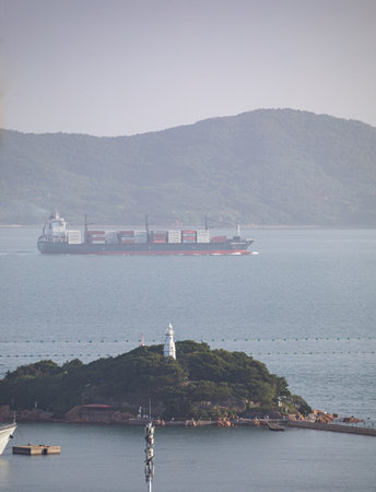 Skryplyov Island and ships in the Japanese Sea. Lighthouse at the end of the world. Vladivostok, Russia