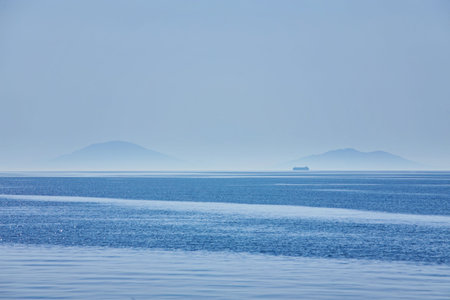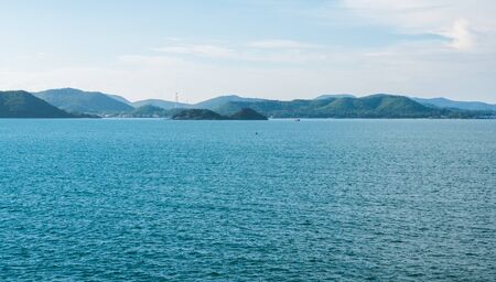 The view of the sea in the sunny day with blue sky and mountain and ships in the background. Calm sea and water. Sea background, wave pattern. Nature concept.