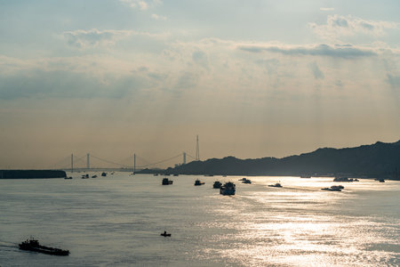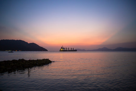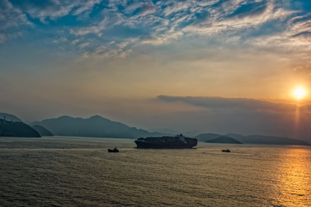 Hong Kong ocean sunset mountain heaven background nautical vessel cargo boat industry